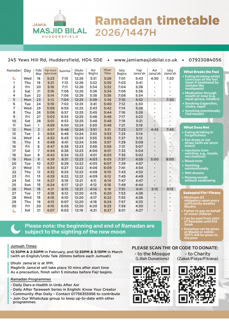 Jamia Masjid Bilal, established in the 1970s, stands among Huddersfield’s earliest masjids and serves as a spiritual and communal cornerstone for local Muslims. The Masjid strives to meet the educational, religious, and spiritual needs of our community. With a vision beyond the prayer hall, we remain dedicated to serving all levels of the community and uplifting the next generation.