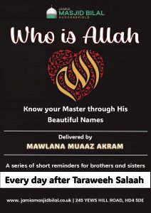 - Dars of Qur’an (Every Sunday after Dhuhr) – Urdu